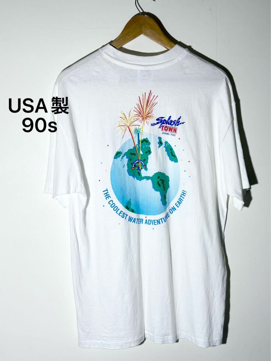 - USA製 90s Hanes ヘインズ 白 ホワイト ヴィンテージ Tシャツ プリント 古着 splashtown シングルステッチ バック ワンポイント アメリカ
