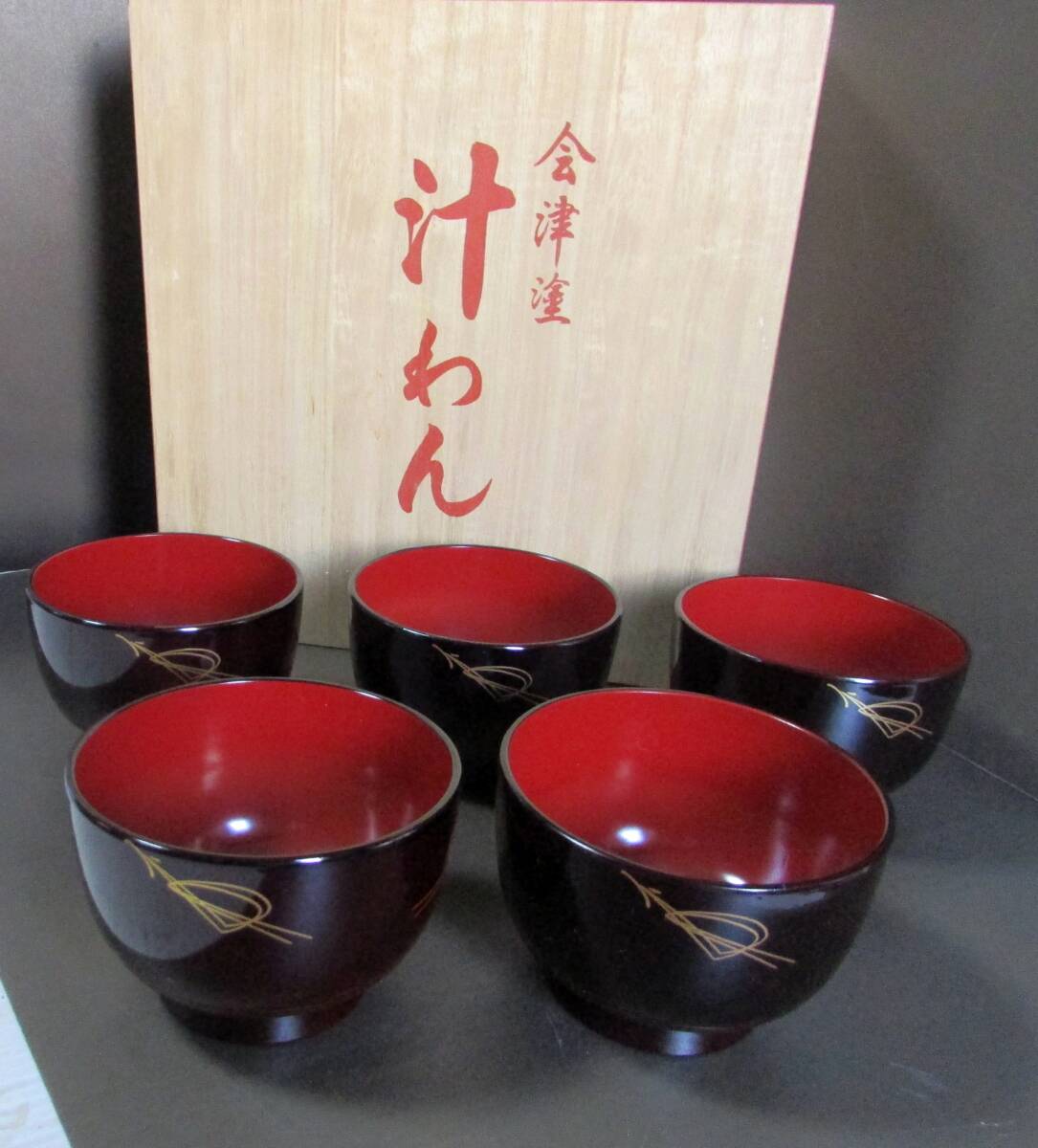 - 会津塗 汁椀 (5客セット)留塗 内朱/金彩松葉紋 木粉合成/樹脂 共箱 約:(11cmxH7㎝)