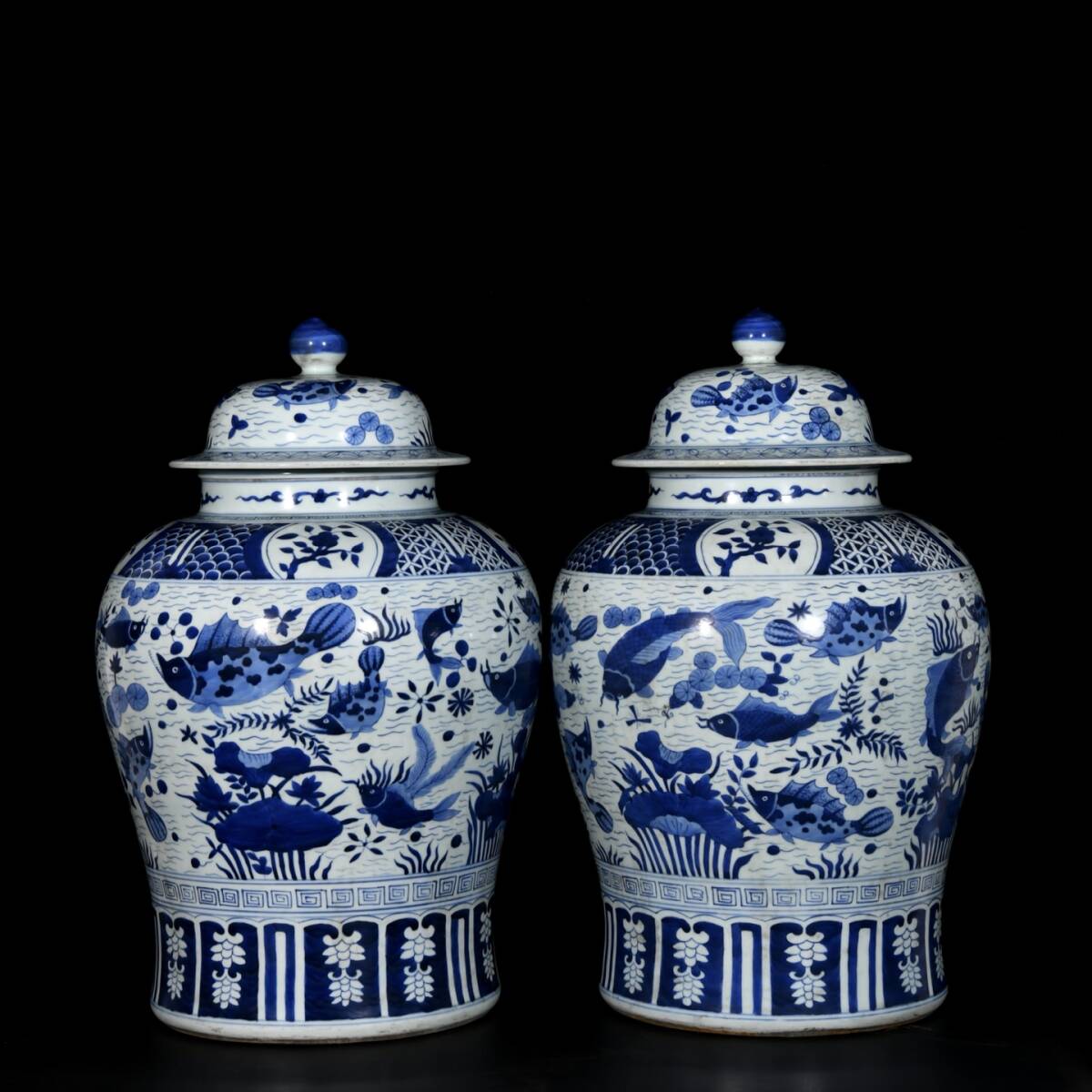 > 6+GV3495「東洋美術」 中国骨董 人間国宝 磁器製品【魚と藻の模様が描かれた青と白の将軍壺のペア】 旧物 孤品 珍品 陶磁器 収蔵価値が高い