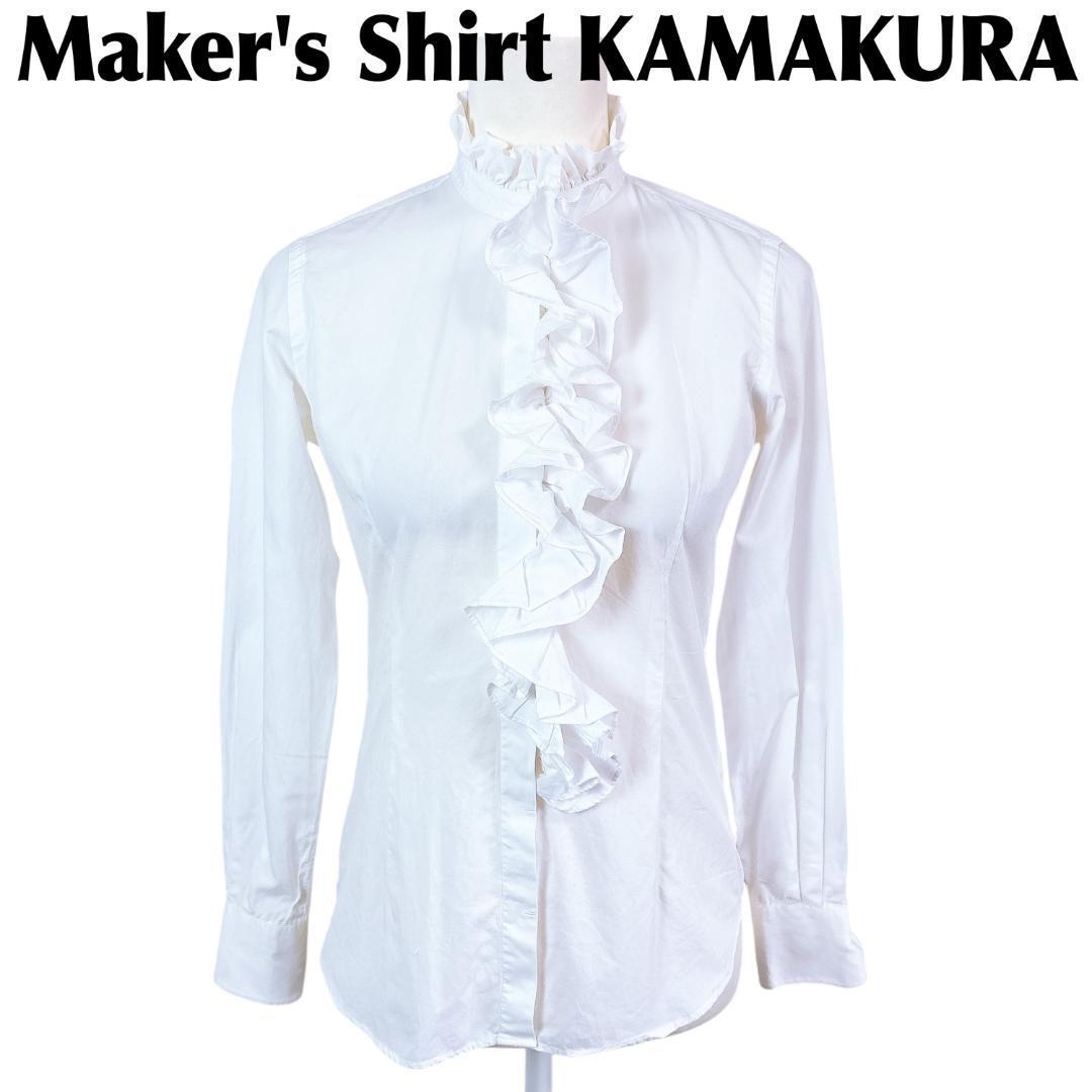 - 【美品】メーカーズシャツ鎌倉 長袖ブラウス センターフリル 9 無地 ホワイト