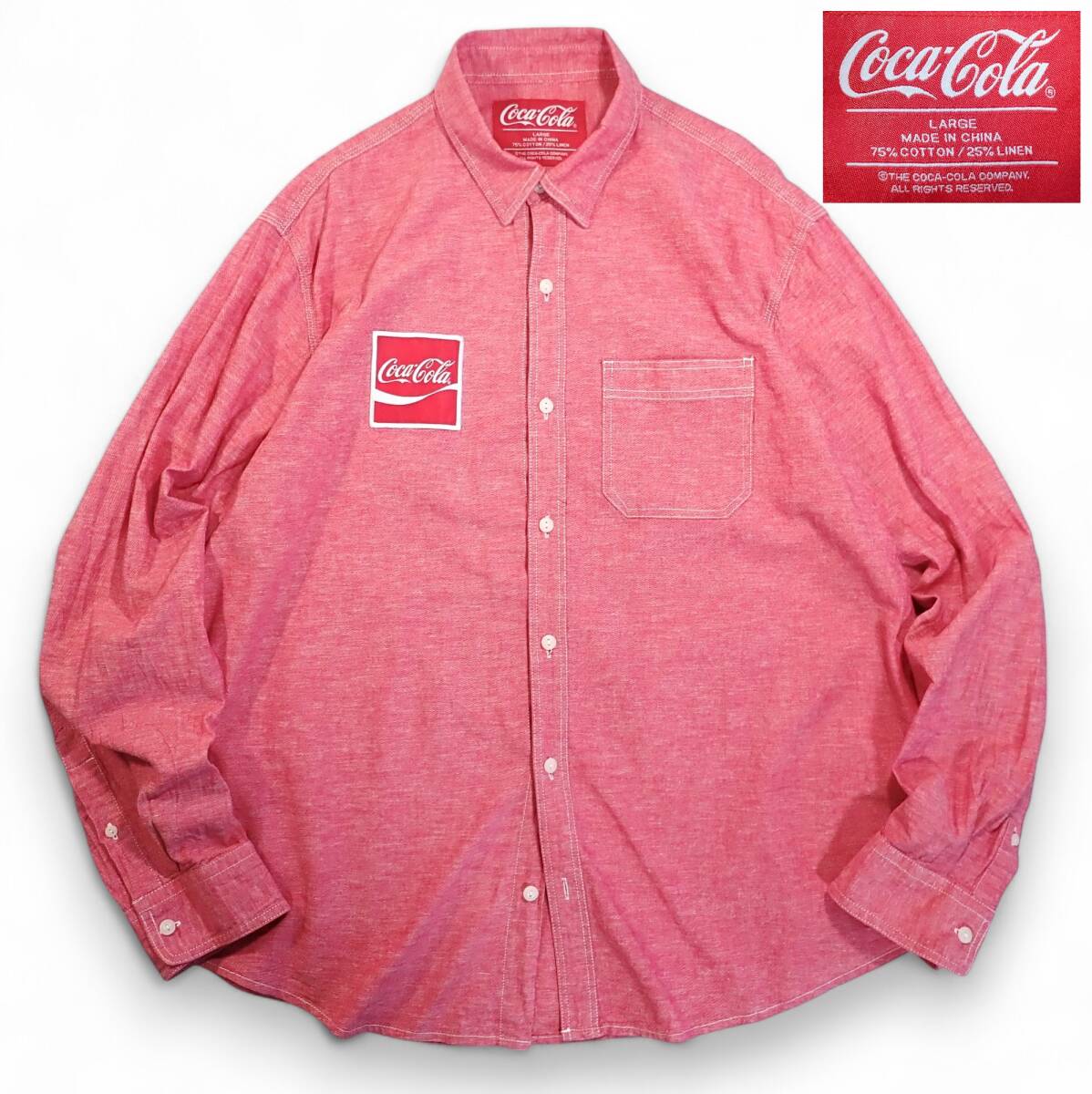 - 6793/美品 Coca-Colaオフィシャル LINEN混 長袖シャツ L●ワッペン 麻 コカ・コーラ Coca Cola コカコーラ ネコ目ボタン●洗濯プレス済古着