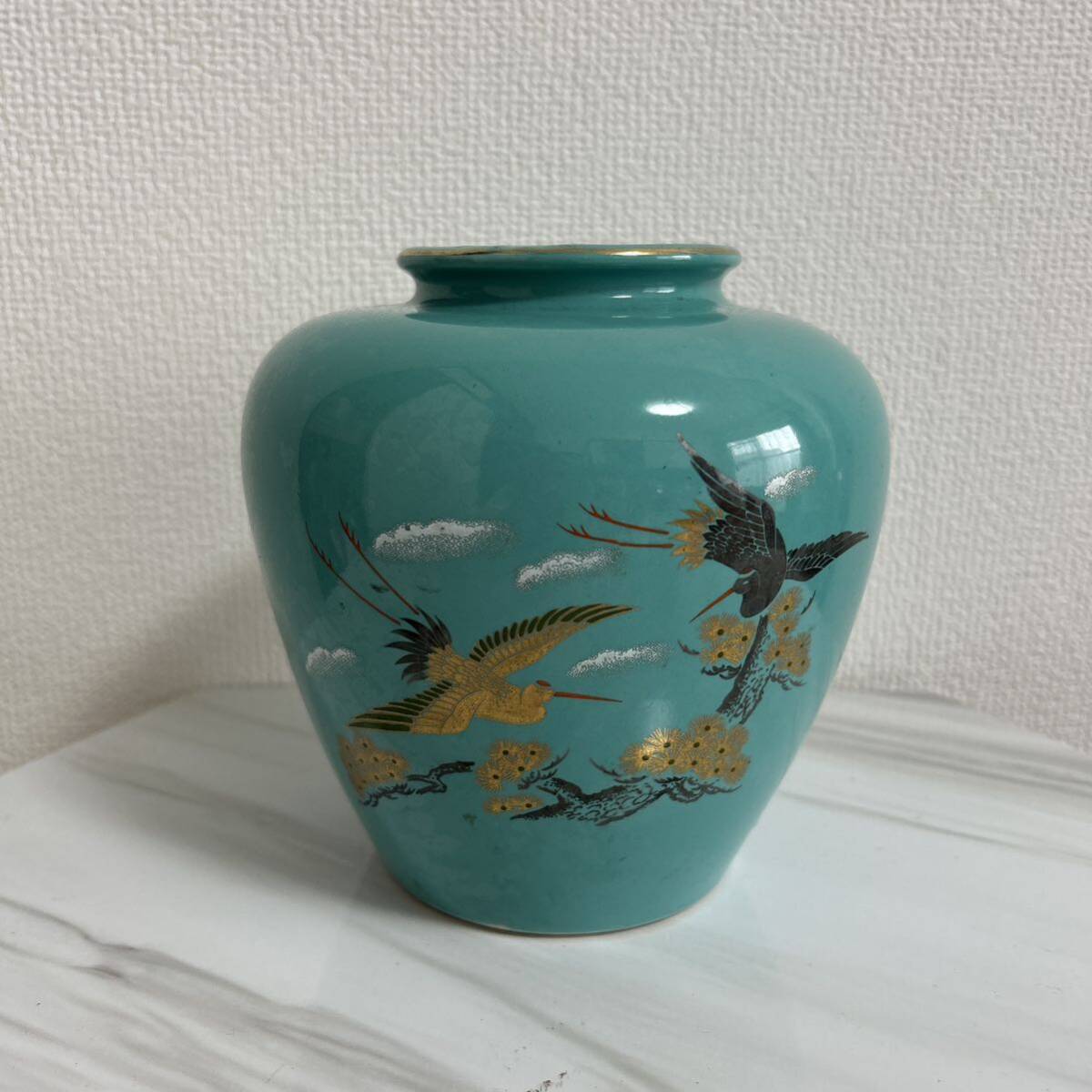 - 陶器 花瓶 花器 ターコイズブルー 鶴&松 フラワーベース
