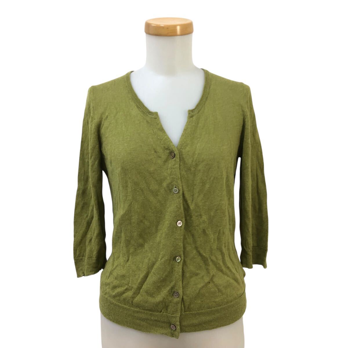 - Nm311-46 MARGARET HOWELL マーガレットハウエル リネン 麻 100% 七分袖 ニット カーディガン カーデ 上着 羽織り トップス グリーン系 Ⅱ