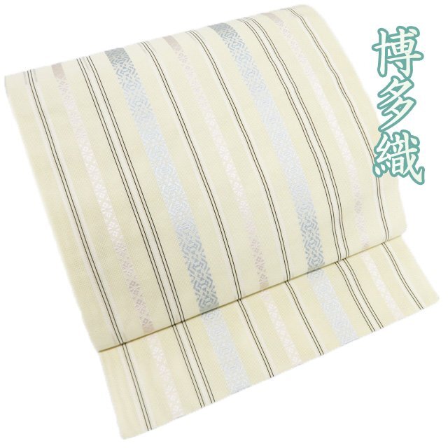 - 夏物 夏帯 名古屋帯 なごや帯 中古 リサイクル 正絹 仕立て上がり 全通 博多織 縦段模様 献上柄 若芽色 多色 きもの北條 A1227-11