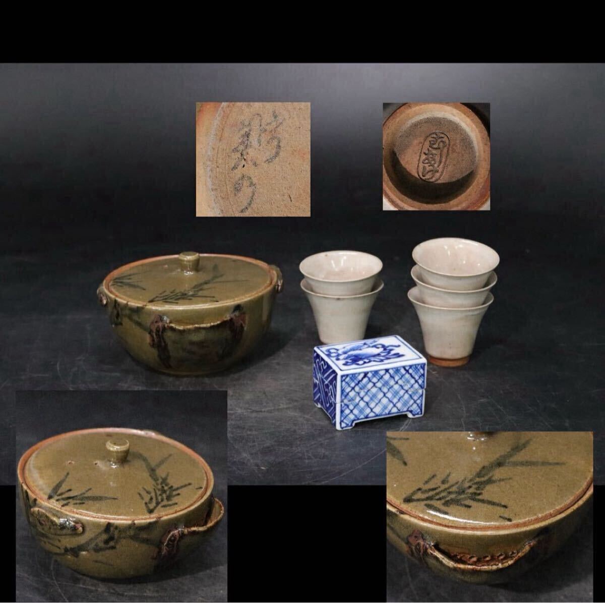- 時代 虫明焼 鉄絵 緑釉 宝瓶 ・ 虫明 煎茶碗 5客 ・ 染付 草文 香合 / 煎茶道具 茶器 希少 .B548