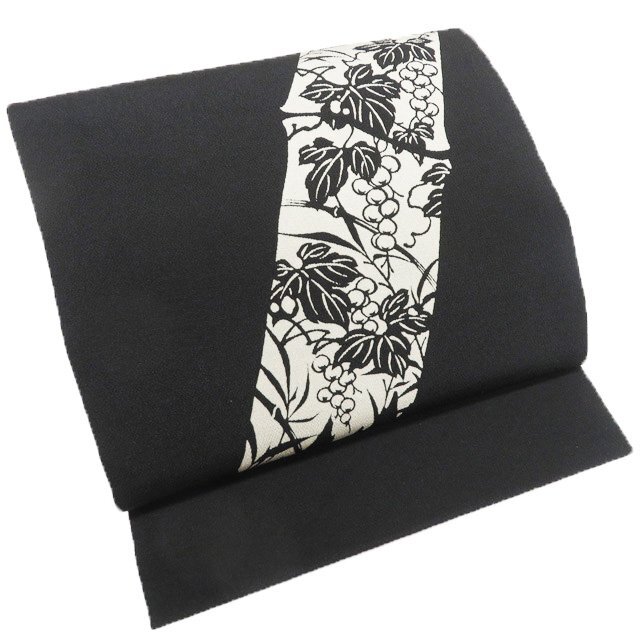 - 名古屋帯 なごや帯 中古 リサイクル 正絹 縮緬地 カジュアル 仕立て上がり 作家物 落款 葡萄文 黒色 絹鼠色 きもの北條 A1229-17