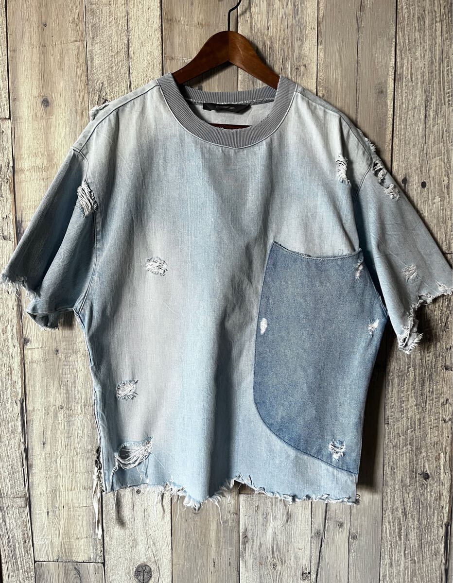 - ■流行シルエット■ ZARA MAN クラッシュ デニム Tシャツ 切り替え ポケット バイカラー ザラ ダメージ加工 デザイン ジップ ワイドサイズ