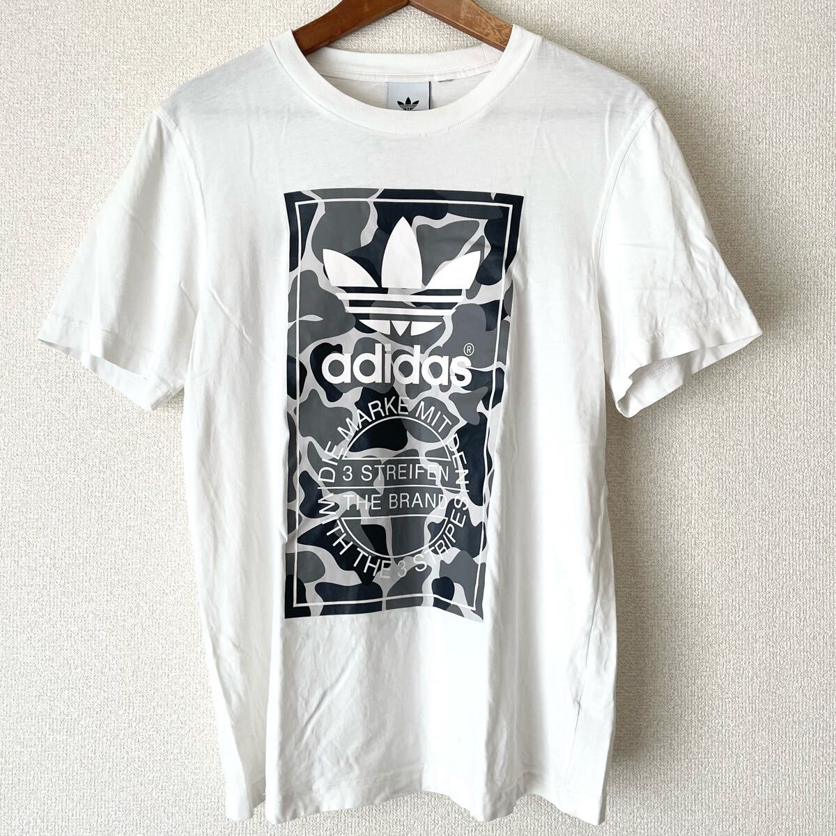 - アディダス Tシャツ ホワイト 半袖 古着 コットン 白 M 迷彩柄 トレフォイル オリジナルス カモフラ 夏 プリント カッコいい