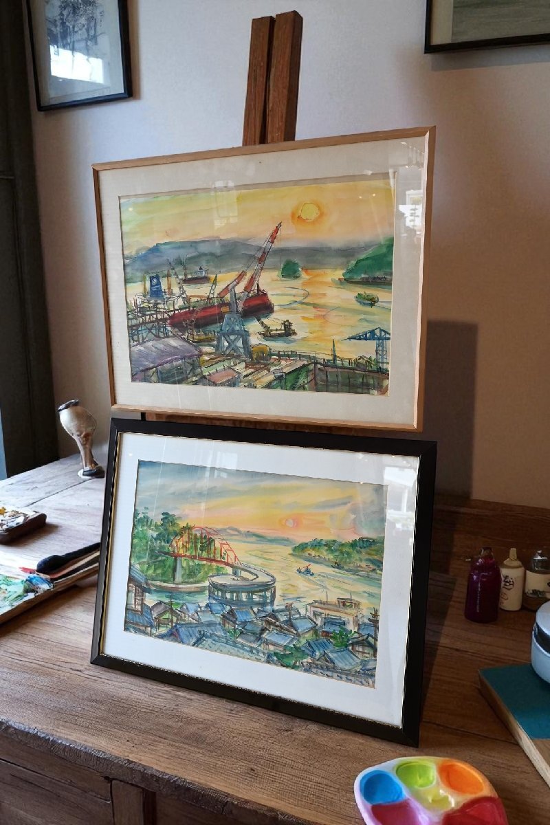 - ○堀田豊 水彩画作品 額 2点セット 呉市の港の風景 呉港 瀬戸内海の絵 モダン アート 古道具のgplus広島 2507i