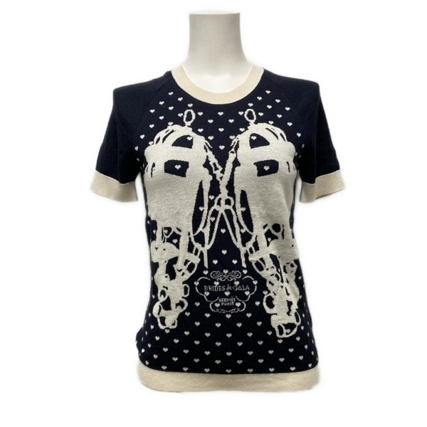 > エルメス HERMES 半袖セーター/ニット サイズ34 S - カシミヤ、シルク ダークネイビー×アイボリー レディース トップス