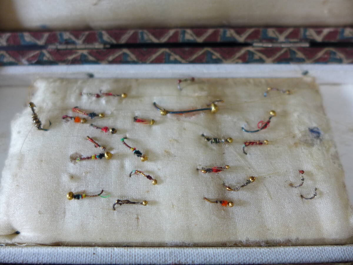 - ★ 時代物 昭和初期頃? 大変古い毛鉤、万年鉤 糸固定部金張り? ケース入り フライフィッシング アンティーク 骨董 ★