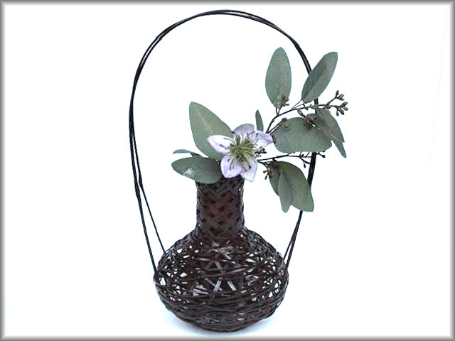 - 茶道具●花入●手付き花入・花籠●ツル首●竹製●やたら編み●エビ茶の塗り