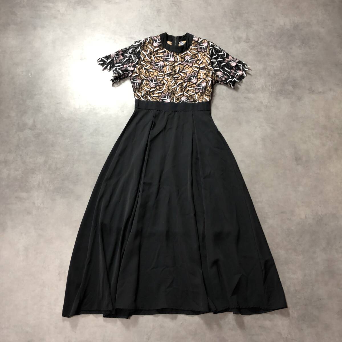 - WQ499●H.J.W huang jin wu:刺繍レースドッキング半袖ロングワンピース ●M● 黒系 ミモレ丈 パーティードレス