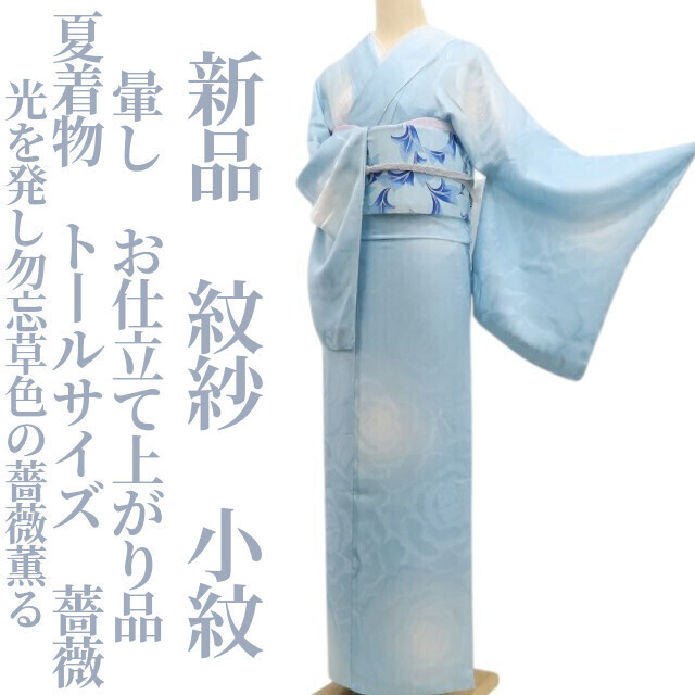 - tomihisa 新品 紋紗 薔薇 暈し お仕立て上がり品 夏着物 仕付け糸付 トールサイズ“光を発し勿忘草色の薔薇薫る”小紋 6286
