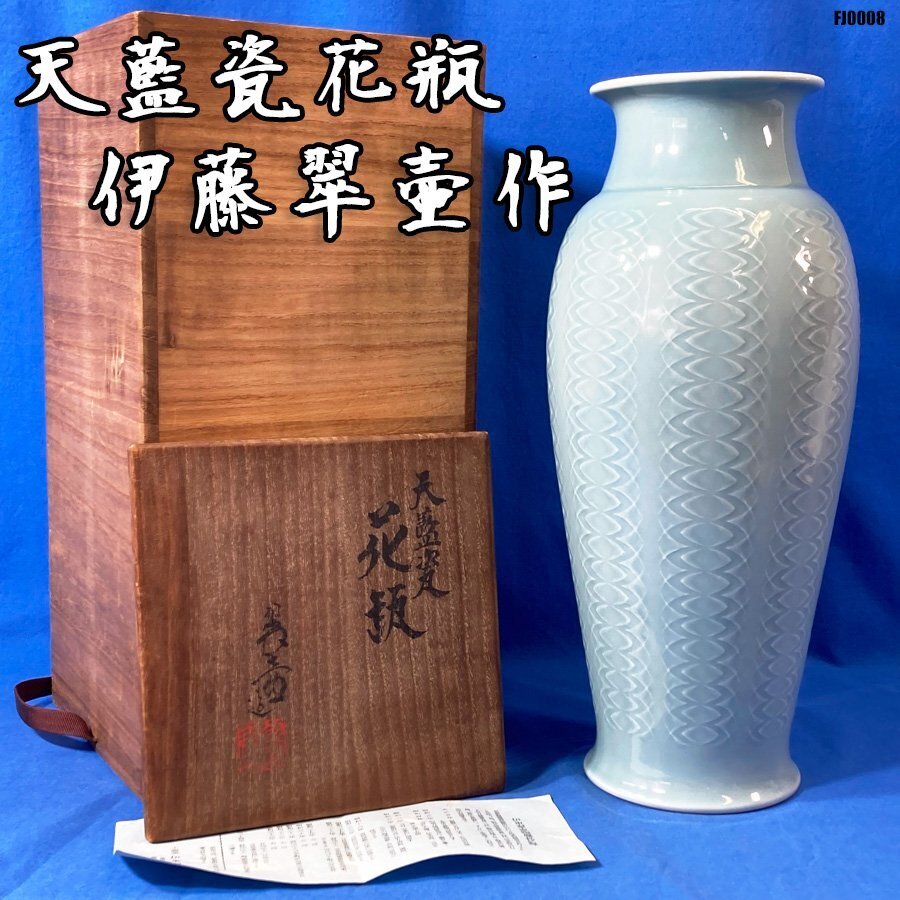 > 天藍瓷 花瓶 伊藤翠壺作 共箱 共布 円柱 丸形 骨董品 古美術品 青磁◇FJ-0008