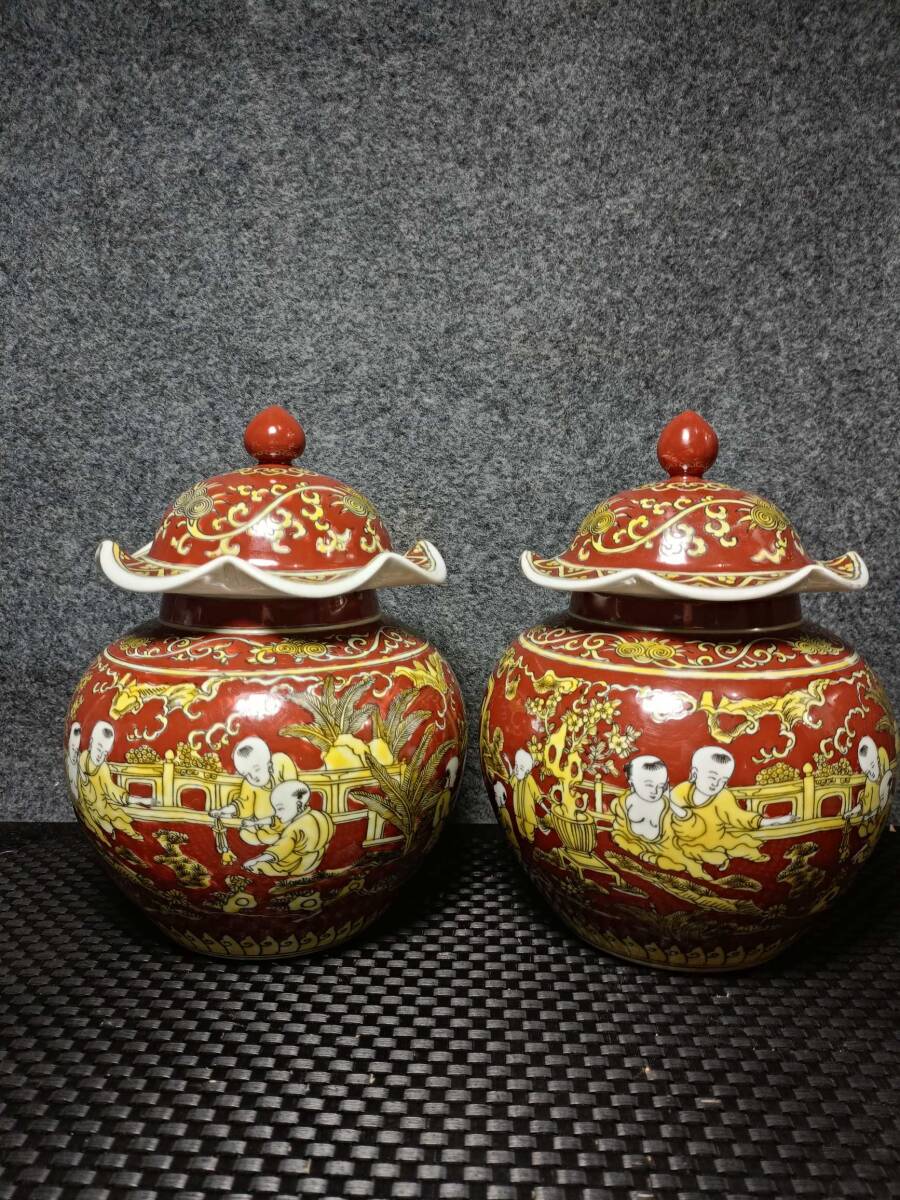 - TM7#4242【3.1】中国骨董 人間国宝 磁器【明,紅上黄釉の沈葉(コーカス)総缶一対】工芸品 施釉陶 青花磁 陶芸 精美彫 置物 收藏品