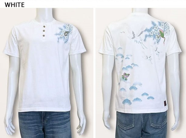 > 和風景ヘンリー半袖Tシャツ◆参丸一 ホワイト XXLサイズ SM-202104 和柄 和風 蛙 さんまるいち かえる