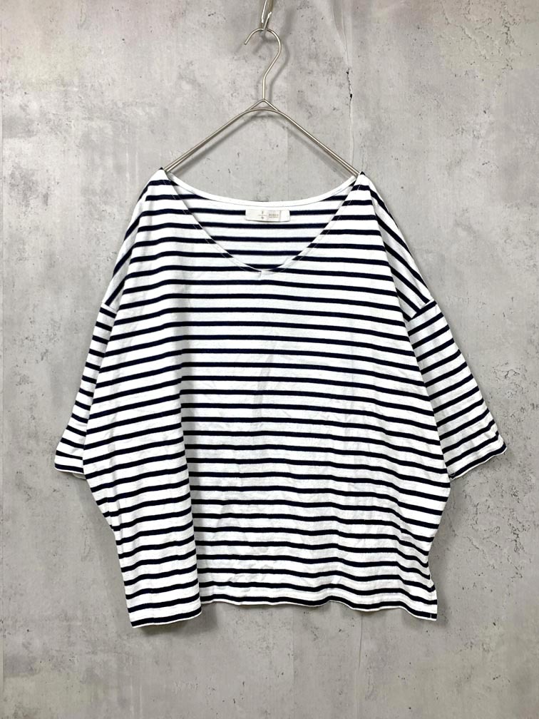 - ゆうパケットOK F by ROSSO アーバンリサーチ コットン Vネック ボーダー 5分袖 カットソー sizeF/白x黒 ■■