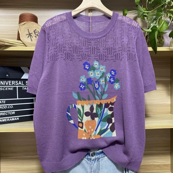 - 25zy サマーニット レディース トップス 高質 ラフ 麻タッチニット チュニック ナチュラル 麻混 サラサラ 涼感 Tシャツ プリント花柄1