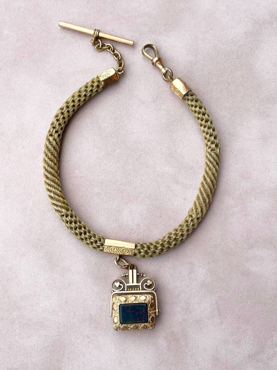 > 英国 アンティーク 金髪 髪編み 懐中時計 チェーン ヴィクトリアン エドワーディアン 1870~1900s ブラッドストーン メメントモリ 珍品