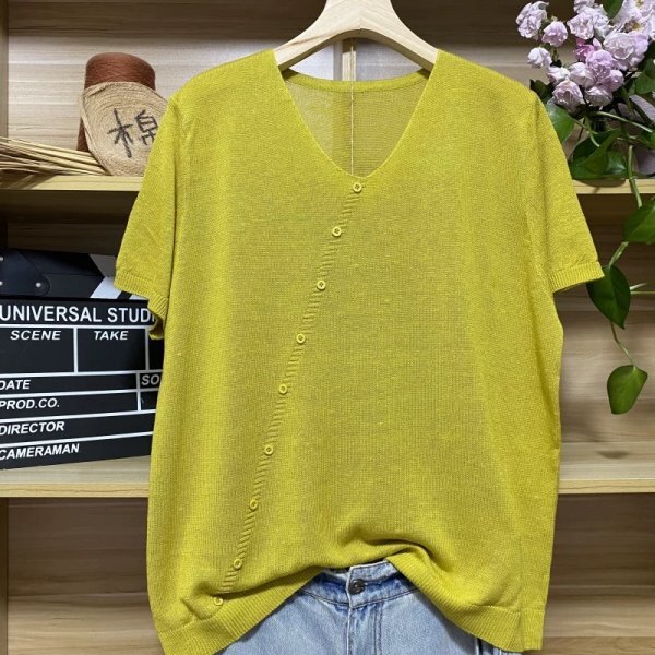 - 25zy サマーニット トップス 高質 ラフ 麻タッチニット チュニック ナチュラル 麻混 サラサラ 涼感 Vネック 斜めボタン 純色2