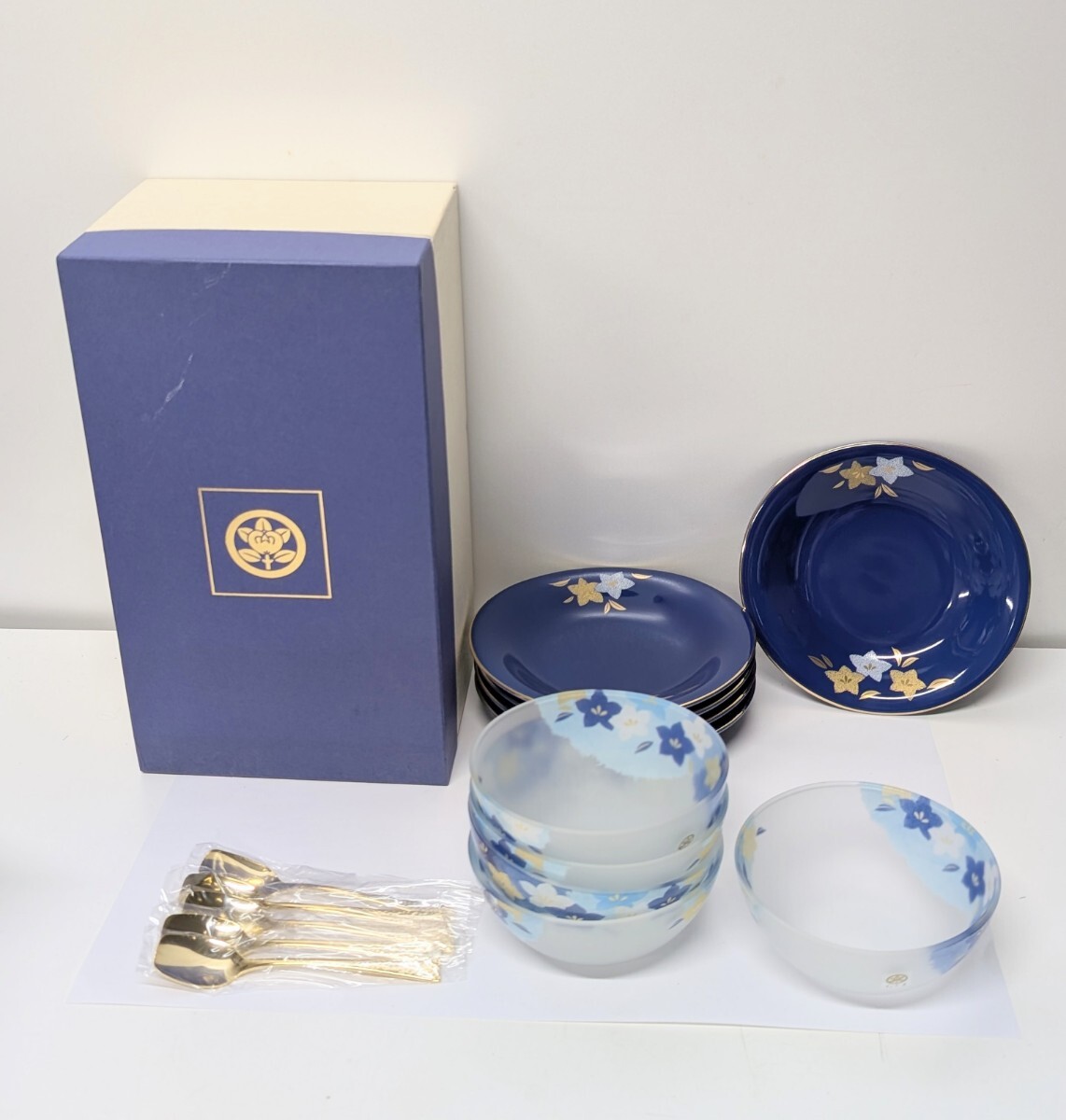 - ☆未使用品☆ たち吉 ききょう柄 ガラス製デザートボウル+陶器受け皿5客セット 箱付 7/9