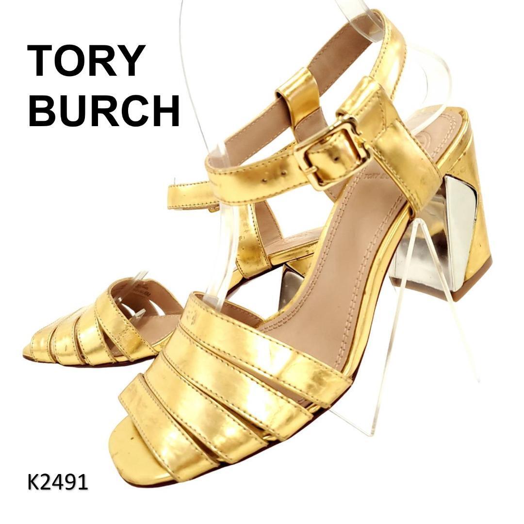 - トリーバーチ 新品 ゴールド ストラップ チャンキーヒール レザー US6