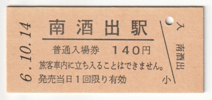 - 平成6年10月14日 水郡線 南酒出駅 140円硬券普通入場券(日付印刷)