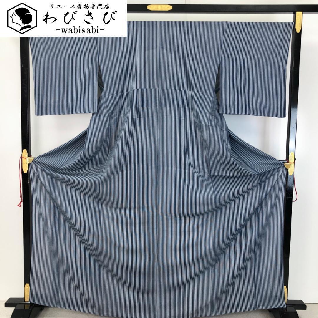 > 夏着物 小紋 絽 縦縞模様 紺藍色 トールサイズ K-5087 着物 きもの kimono 和服 和装 中古 リサイクル着物 【送料無料】