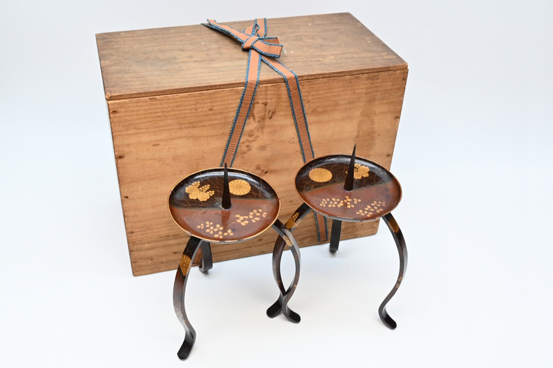 - 蒔絵 燭台 ■ 美しい蝋燭立て 蒔絵[ 菊 五七の桐 萩 蒔絵 金梨地 h約22.5cm ] 一対 ■ 時代 漆塗 木箱入り■