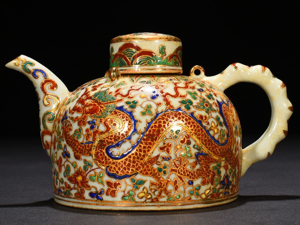 - ■XM106■明宣徳 五彩描金纏枝龍紋竹節壺 時代物 古玩 唐物 古陶磁器■