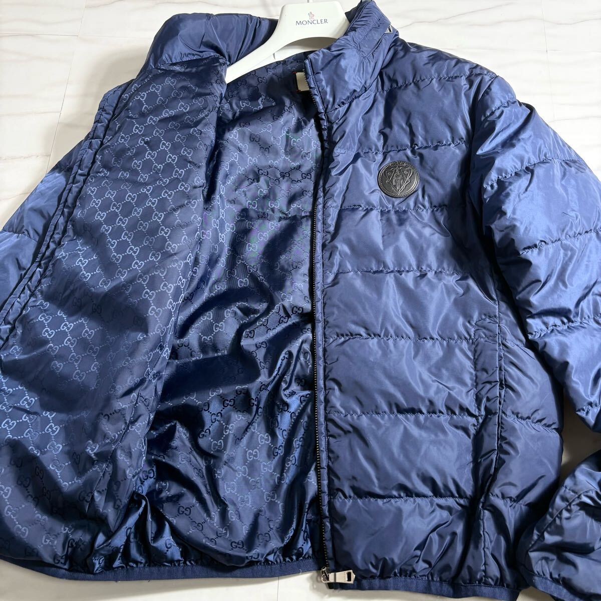 > 極美品【圧巻総GG柄】グッチ ダウンジャケット レザーパッチ 牛革 ワッペン フード収納 近年タグ ブルー 青 GUCCI メンズ アウター 44