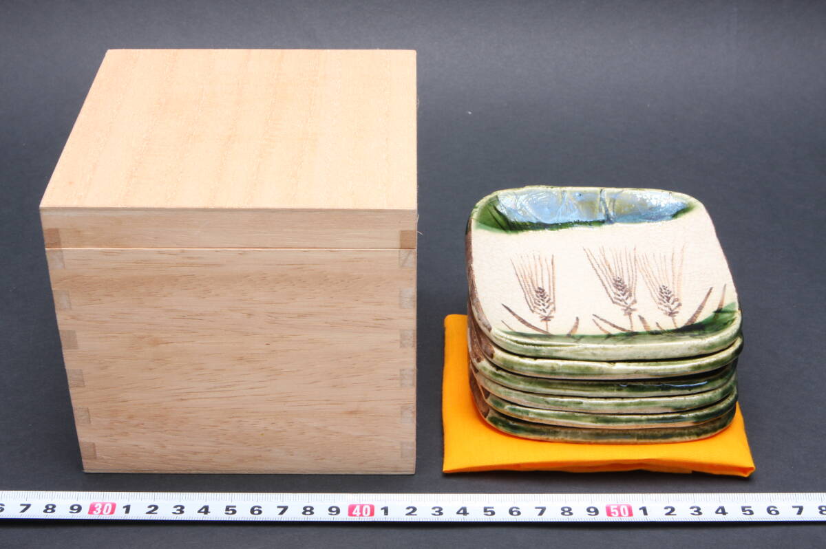 - 54552 未使用長期保管品 織部焼 中島春草 穂文 四方皿 小皿 六客組 木箱付