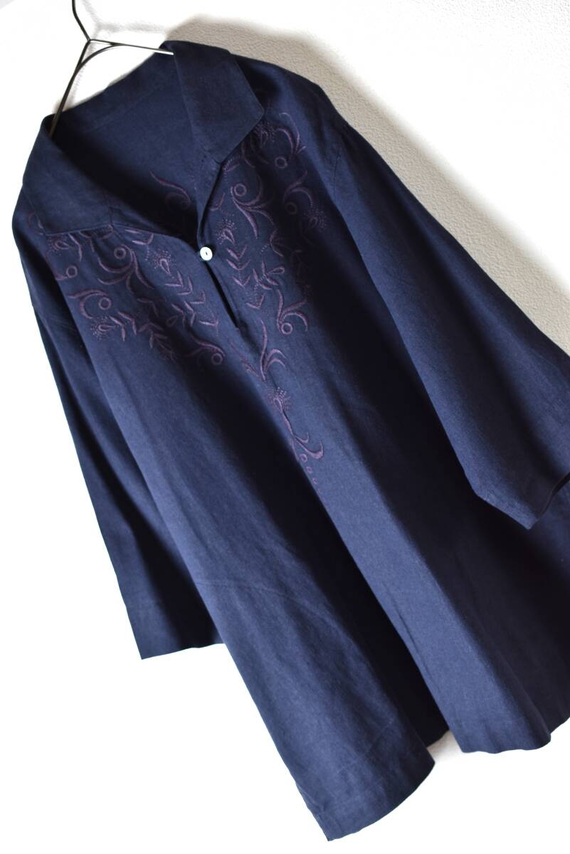 - 横浜元町グレープ grape 刺繍柄入りリネンオーバーブラウス 紺色 チュニック丈