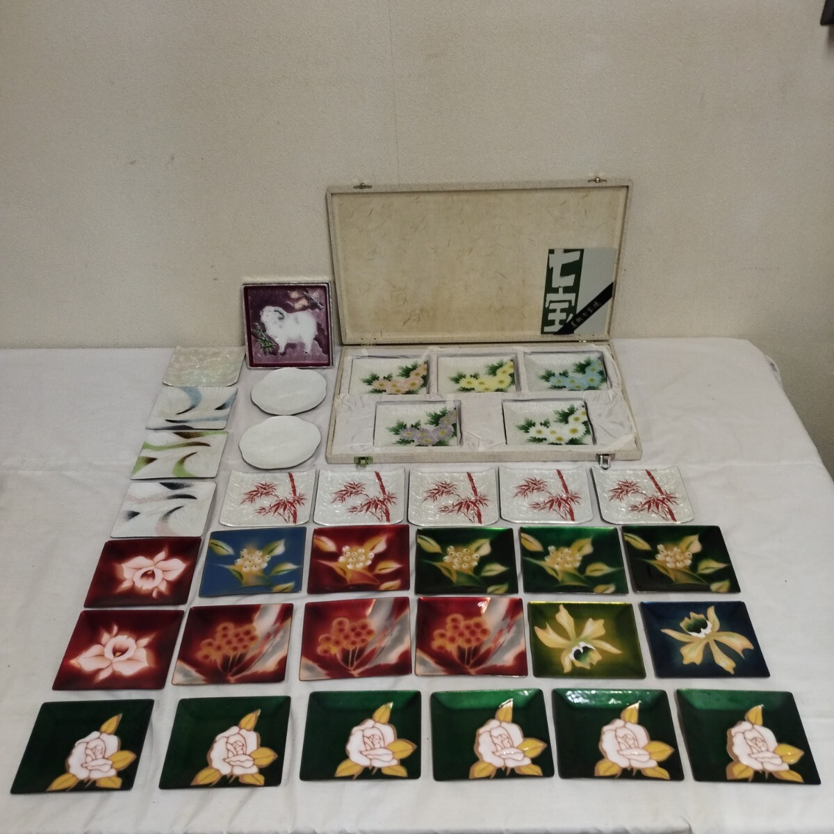 - 0718C 七宝焼 セット まとめ 角皿 小皿 銘々皿 菓子皿 和食器 食器 茶道具 伝統工芸品 薔薇 蘭 花柄 竹 箱入り 京七宝