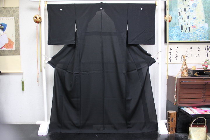 - きもの今昔8767 黒の礼装 夏用正絹駒絽 広衿単衣喪服きもの 草木3度染「純黒」京都紋付染 しつけ付き 身丈170cm