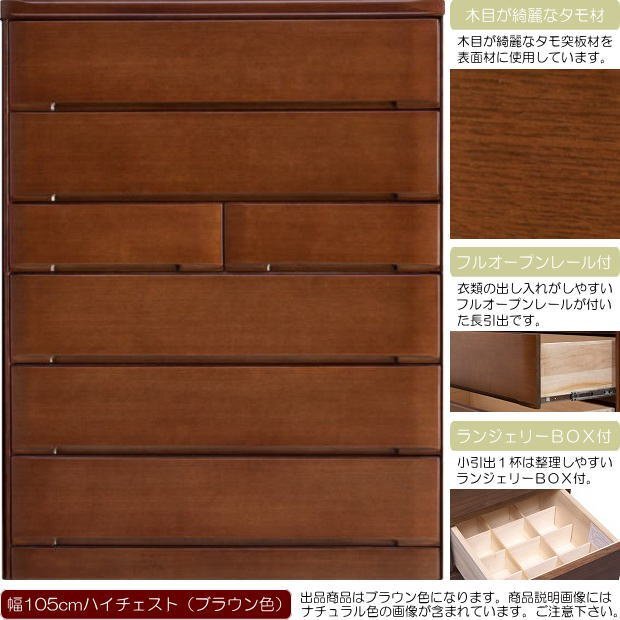 - スタンダードデザインの木目が綺麗なタモ材仕様幅105cmハイチェスト(ブラウン色) 木製 タンス 天然木 フルオープンレール アリ組