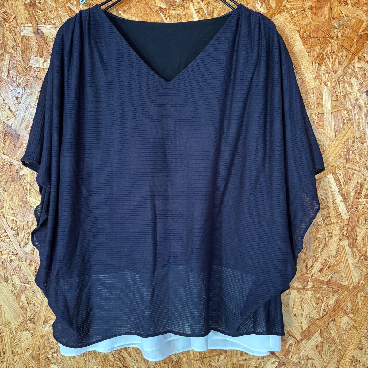 - 美品 日本製 お洒落 裾レース 背中ボタン Vネック カットソー 半袖 ワールド系 ネイビー トップス レディース 4772