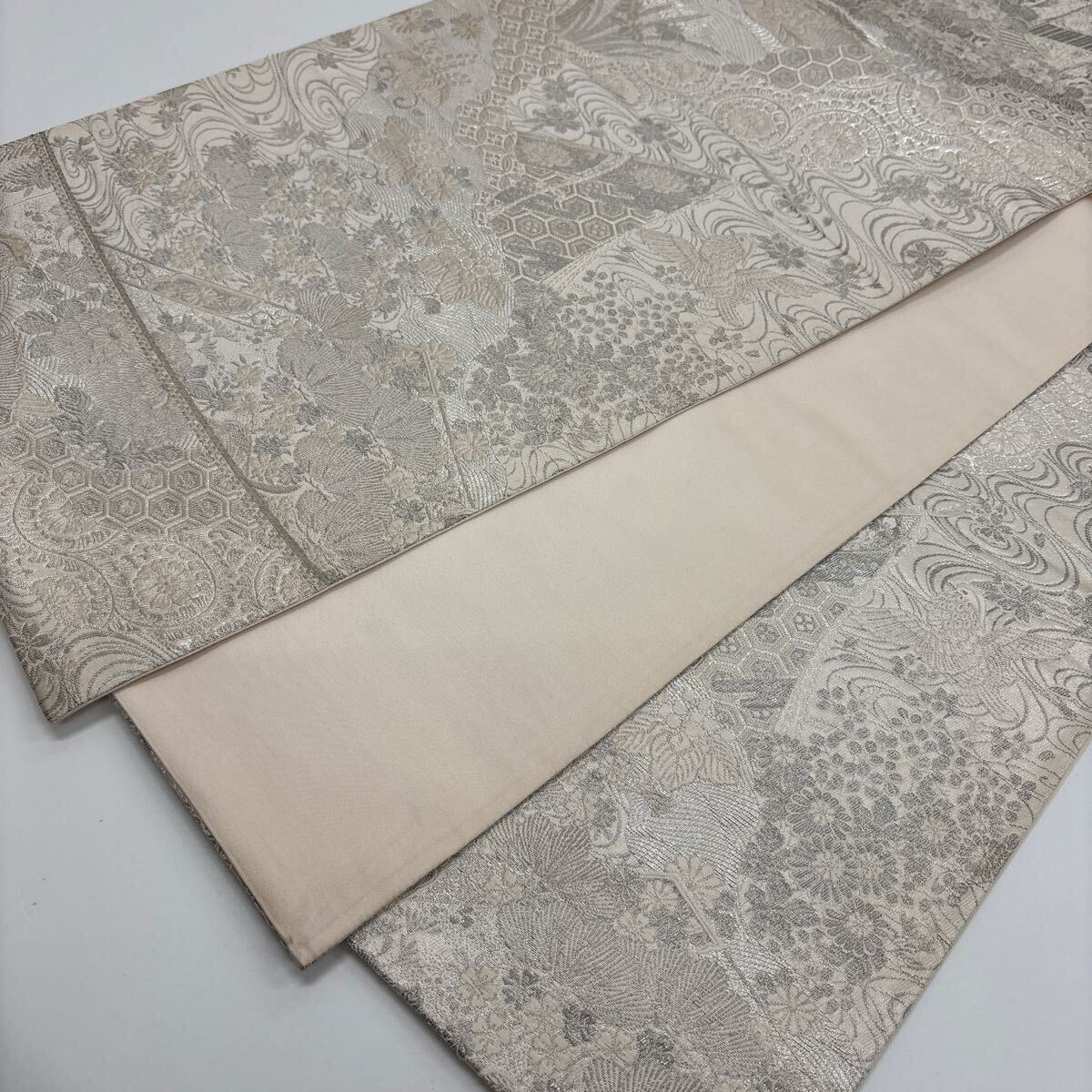 - 袋帯 銀糸 流水 御所車 上品な織出し 正絹 着物 W-2981