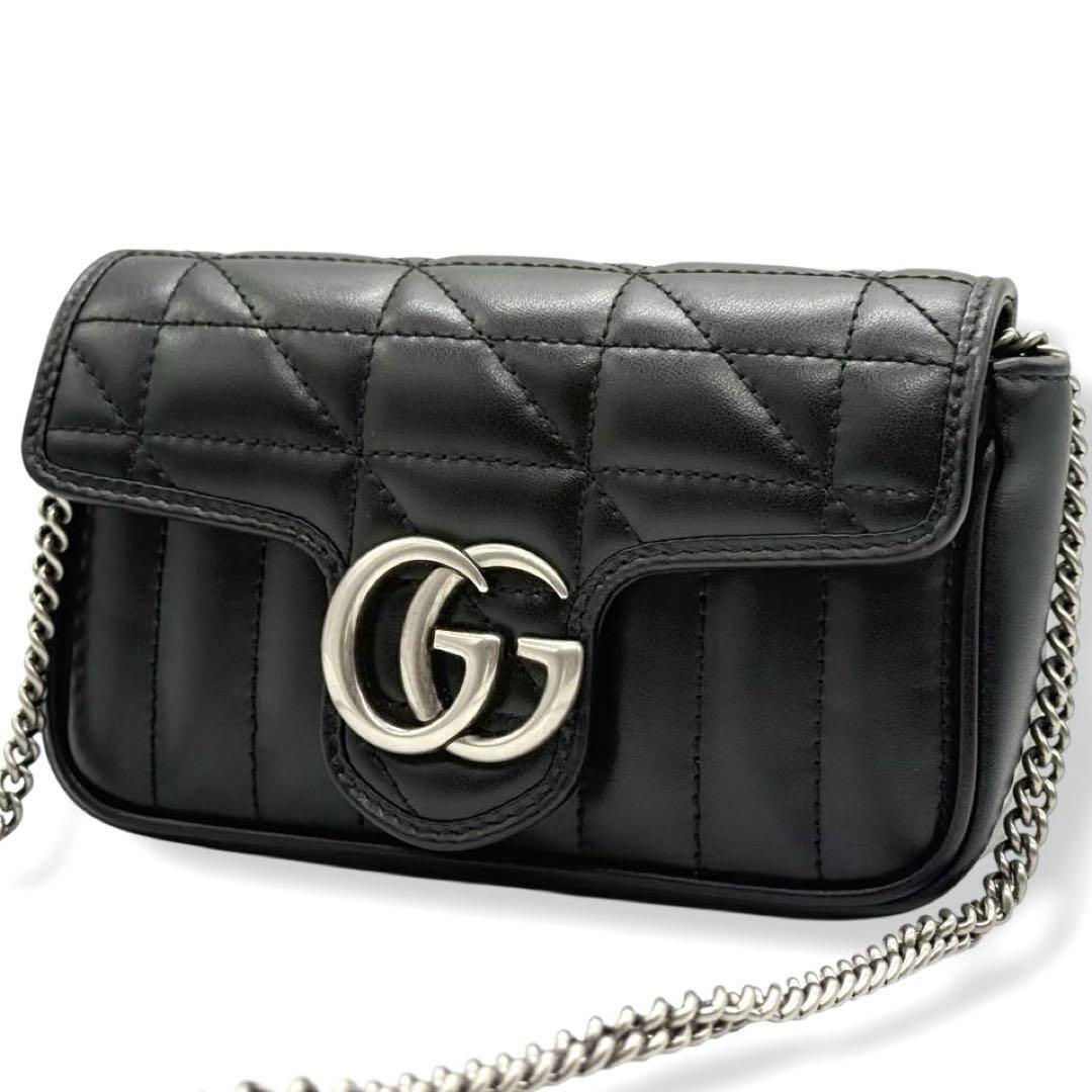 - 新品同様 グッチ スーパーミニバッグ GGマーモント キルティング ブラック GUCCI 476433 チェーン ショルダーバッグ シルバー3746