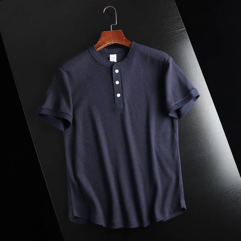 > T2812-2XLネイビー 新品 綿 サマー ヘンリーネック 半袖Tシャツ メンズ 軽量 通気 ひんやり 薄手 盛夏 クールビズ ワッフル生地 Tシャツ