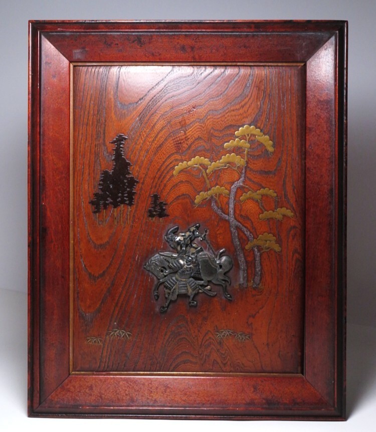 - 【10802】明治時代 欅板 武者 彫金 象嵌入 飾り額(初品・買取品)