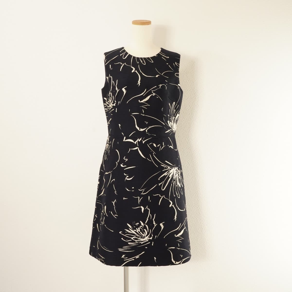 商品名:自由区 ジユウク 上品 ジャガード ワンピース ドレス ノースリーブ ひざ丈 タック フレア 紺