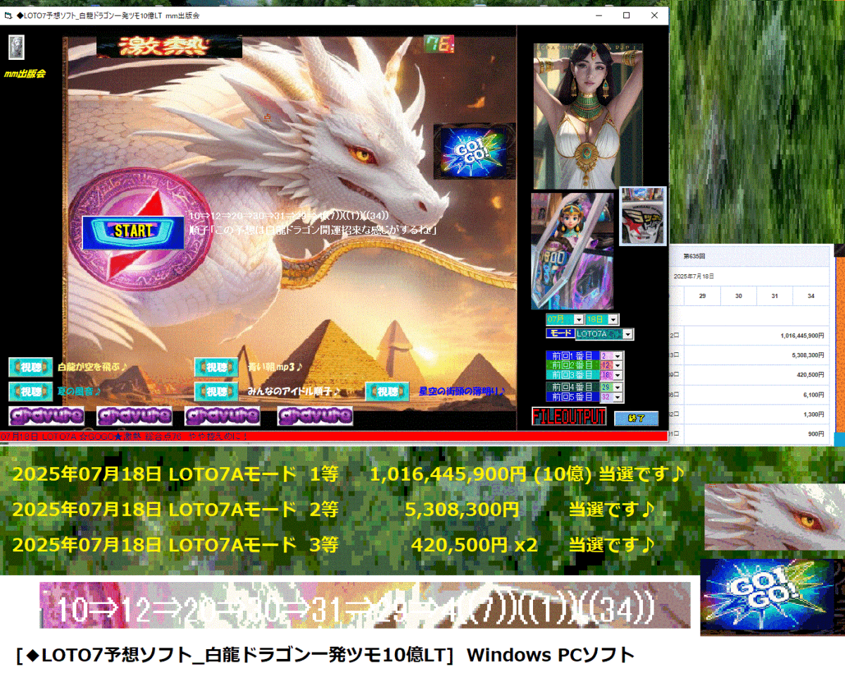 夏の新作 [◆LOTO7予想ソフト_白龍ドラゴン一発ツモ10億LT] をご案内申し上げます。 最強ソフトのロト7 フォーメーション予想版シリーズがまた登場! インストラクターの順子ちゃんが高額当選を予感!!!他ソフトでも、この「順子ちゃん」コラボは、ご案内後に1等高額当選が出ていることでも、有名になっています。2025年07月18日 LOTO7Aモード 1等 1,016,445,900円 (10億) 当選です♪2025年07月18日 LOTO7Aモード 2等 5,308,300円 当選です♪2025年07月18日 LOTO7Aモード 3等 420,500円 x2 当選です♪ もしや、順子ちゃんって、超ラッキーメーカーですか?予想中に新曲「星空の街頭の薄明り」や「みんなのアイドル順子」が流れると超激熱です!!!「ラッキートリガー」発動で、3000万円以上当選の87%期待度になります。 このスペックは、ロト予想界史上で歴史的にも最強仕様の名機となります。今主流の「先ばれ告知音」が鳴れば、更に高額当選濃厚!特にロト7のインストラクターのアイドル?!順子ちゃんが「神回」を予告・・・この日は激熱!!2025年07月18日 LOTO7Aモード 1等 1,016,445,900円 (10億) 当選です♪2025年07月18日 LOTO7Aモード 2等 5,308,300円 当選です♪2025年07月18日 LOTO7Aモード 3等 420,500円 x2 当選です♪ 2025年07月18日 LOTO7Aモード 1等 1,016,445,900円 (10億) 当選です♪2025年07月18日 LOTO7Aモード 2等 5,308,300円 当選です♪2025年07月18日 LOTO7Aモード 3等 420,500円 x2 当選です♪ [◆LOTO7予想ソフト_白龍ドラゴン一発ツモ10億LT]07月18日 LOTO7A ☆GOGO★激熱 総合点76 やや控えめに! [◆LOTO7予想ソフト_白龍ドラゴン一発ツモ10億LT][10⇒12⇒20⇒30⇒31⇒29⇒4((7))((1))((34))][◆LOTO7予想ソフト_白龍ドラゴン一発ツモ10億LT][順子「この予想は白龍ドラゴン開運招来な感じがするね!」][◆LOTO7予想ソフト_白龍ドラゴン一発ツモ10億LT]順子「今日も期待するわよ♪」今回は、新機能、業界開発の機能を2つ搭載しています!二つ目が、「ラッキートリガー」です。3000万円以上当選の90%期待度になります。あなた様も、今日からでも、一つロトで楽しみを持つのも、どうですか。もうすでに人生が楽しく変わっています。今回は、特典グラビア 順子ちゃんの画像が観れる機能が付いています もー順子ちゃんに、身も心もまかせちゃってください。このツールは、診断チェック機能を装備した、予想ソフトです。 1.買いたいロト券が、本当に信頼できるのか、ガチで勝負しても、大丈夫なのか? 2.買い目を数点に絞りたいが、有望な勝負できる数字を、知っておきたい。 3.ロト7で買いたいが、1、2点で勝負に適した買い目を知りたい。 要は、このソフト 一点一点の買い目の診断と、勝負になる絞った予想の買い目も出してくれます。 診断した買い目の総合の評価点数や、どんな勝負度合いが良いかの指示も出ます。実際に、どんな当て方を過去にこの予想ツールがしてきたのかを、ご説明いたします。こんなシンプルなツールで、こんなに高配当などが立て続けに当たるのですから、楽です。[[◆LOTO7予想ソフト_白龍ドラゴン一発ツモ10億LTの具体的仕様な説明]]・このソフトは、パソコンWindows版の全てに対応しています。Xp Vista 7 8 8.1 10 11動作確認済み ・買い目は、全てのロト7基本 (予想にもボーナス数字を含むため)、LOTO7 3点~7点 です。・条件により、倍の数の買い目が出ることが御座います。基本点数とは異なる数の予想数になることがあります。・熱い予告の時に、順子ちゃん、★GOGO★ランプも点灯します。・新機能、業界開発の「先ばれ告知音」機能を搭載しています!・新機能、業界開発の「ラッキートリガー」発動で3000万円以上当選の87%期待度になります。・予想中に新曲「星空の街頭の薄明り」や「みんなのアイドル順子」が流れると超激熱です!!!・順子ちゃんが、本来持つあなたの強運を引き出そうと暖かい励ましでメッセージを言ってくれます。・特典グラビア 順子ちゃんの画像が観れる機能が付いています 【演出別期待度】 順子☆ 順子実写☆☆ レインボー☆☆☆ ・買い目の一つ一つについて診断が出来る予想ツールです。・診断だけでなく、LOTO7の勝負の度合いも指南してくれます。・予想ソフトは、過去の当選数字が閲覧、参照などができれば、だれでも簡単に予想できます。・画面を見ての通り、入力箇所も3、4箇所程度で、マウスによる選択形式です。シンプルで簡単です。今だけ、特別にご奉仕価格にて、ご提供致します。 是非お薦めです♪[◆LOTO7予想ソフト_白龍ドラゴン一発ツモ10億LT ロト予想ソフト価格16,298,000円→価格5000円