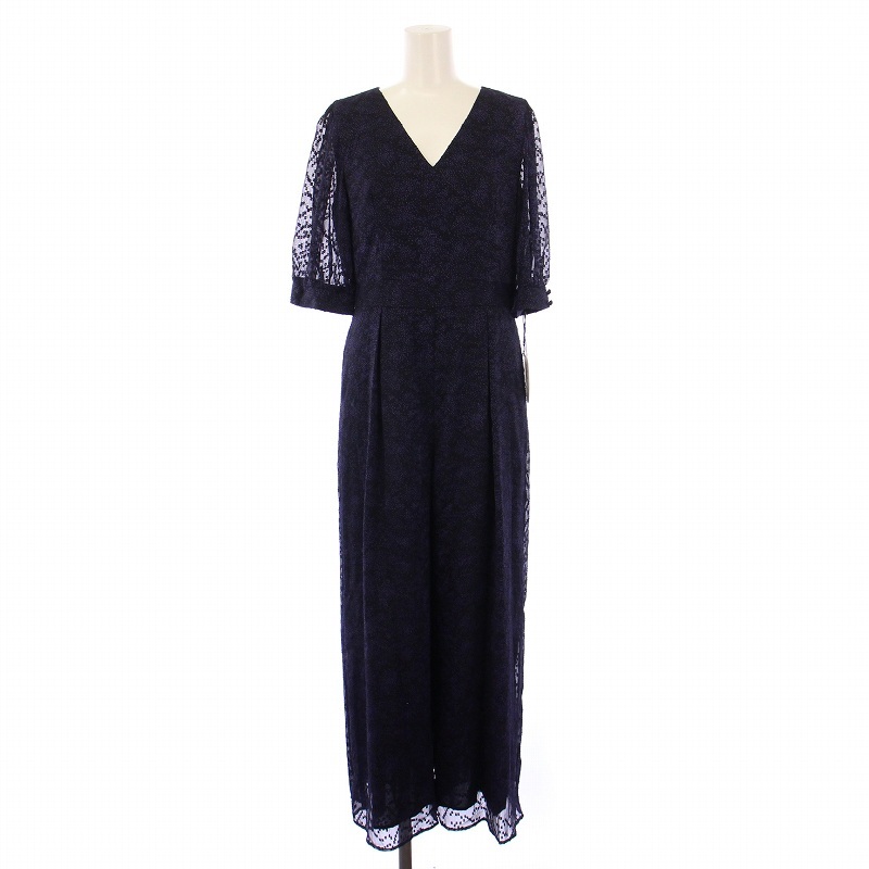 - 未使用品 カエン kaene シフォンドビーオールインワン ワイドパンツ 半袖 Vネック シアー シースルー 38 紺 紫 タグ付き 100513