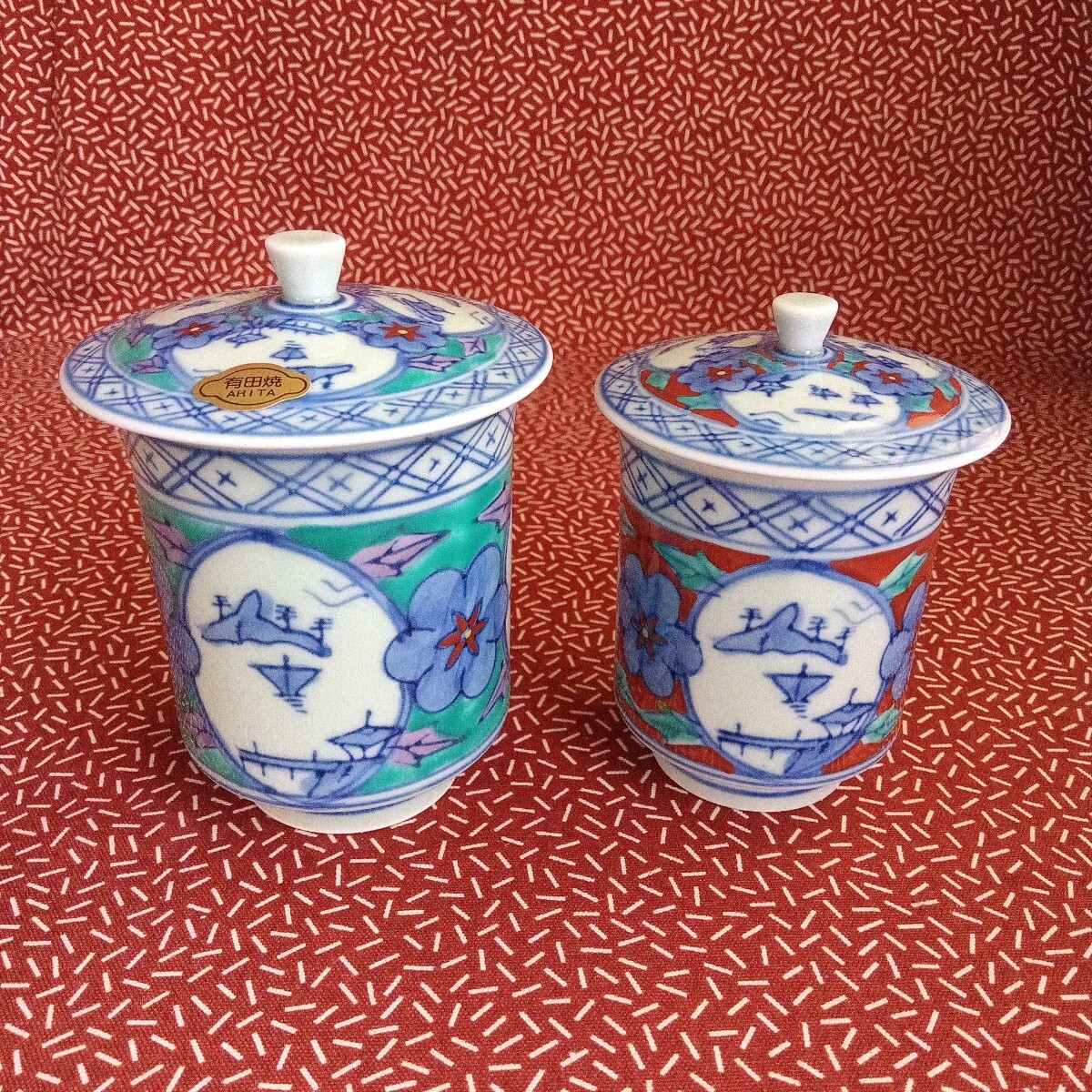 - 中古☆有田焼 夫婦湯呑 昭和 レトロ 重吉 一対 セット 湯呑 湯飲み 蓋つき