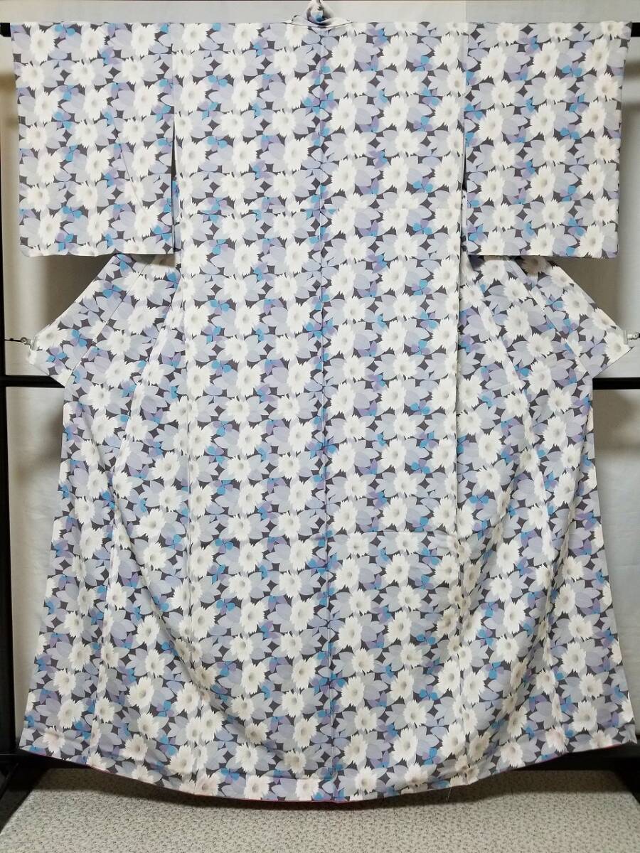 > 【桐輪】化繊地.小紋☆送料無料*仕付け糸付{強撚糸*ポリエステル100%*袷.小紋}*身丈164-裄65*紫み暗い灰色地*暈し染の花と蝶々*№4443