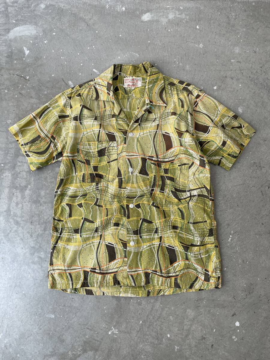 > 希少!USA製?50s 60s 70s コットンシャツ 開襟 BOXシルエット アロハシャツ aloha アシンメトリー アトミック柄 オープンカラー