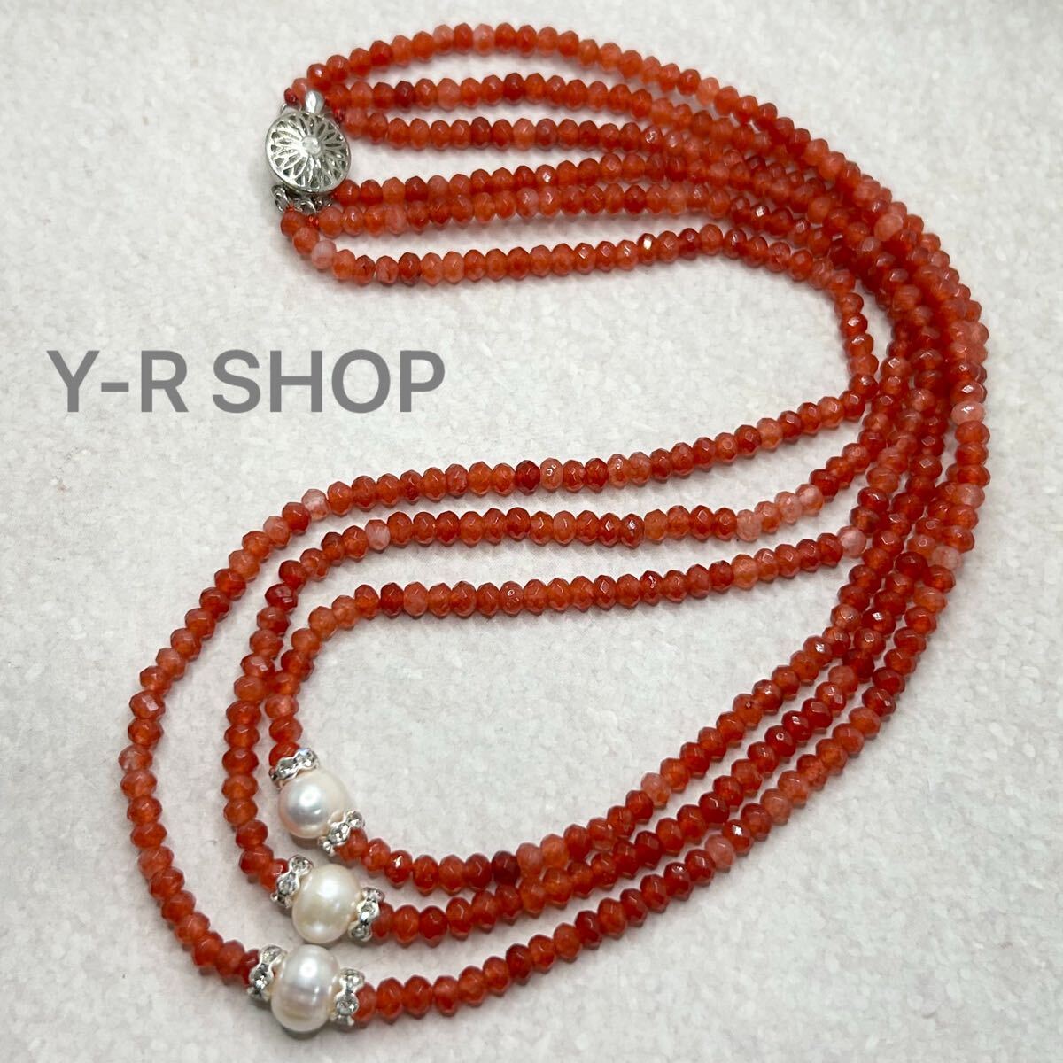 - 天然石★レッドクォーツと淡水パールの3連ネックレス★レディースネックレスシルバーアクセサリーカラーストーンエスニックアジアン雑貨