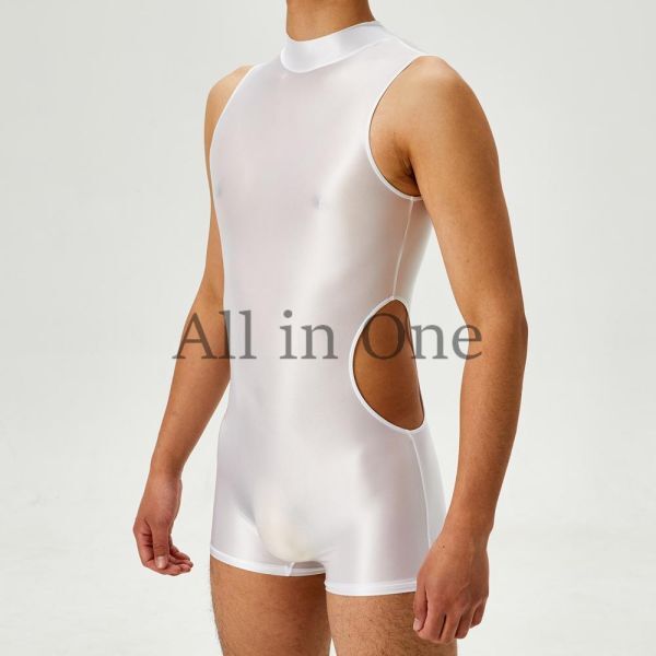 > 169-201-25 メンズ ツヤツヤ サイドカット ジャンプスーツ【ホワイト,Mサイズ】男性 コスプレ 光沢 サテン セクシー ボディスーツ .1